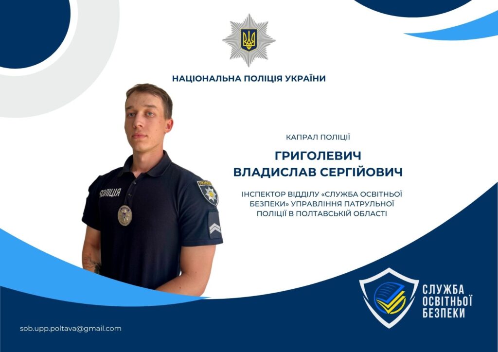 Офіцер відділу «Служба освітньої безпеки» управління патрульної поліції в Полтавській області Департаменту патрульної поліції виконує три основні функції: правоохоронну, наставницьку та просвітницьку. Інспектор реагує на правопорушення в школі, проводить профілактичні бесіди з учнями, бере активну участь в педагогічних нарадах та батьківських зборах і сприяє національно-патріотичному вихованню молоді. Окрім цього, інспектор вживає заходів щодо виявлення вибухонебезпечних чи підозрілих предметів, а також у разі необхідності взаємодіє з екстреними службами і виконує інші завдання з питань створення безпечного освітнього середовища для всіх учасників освітнього процесу. Також інспектор спілкується з учнями щодо запобігання вживання алкоголю, тютюнових виробів, наркотиків, попереджає прояви булінгу.