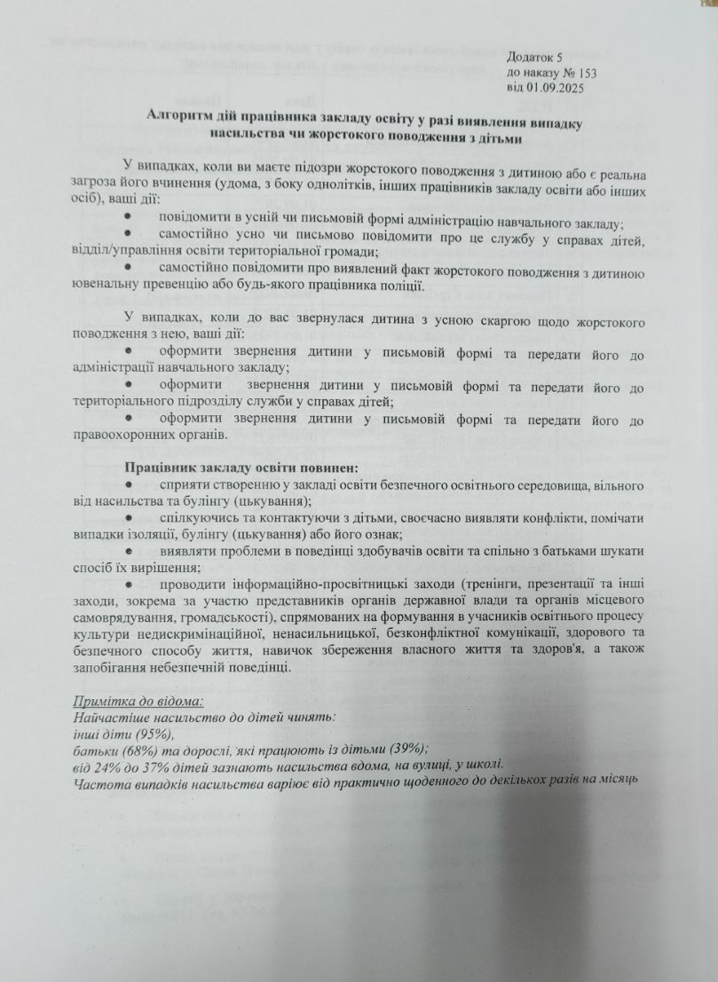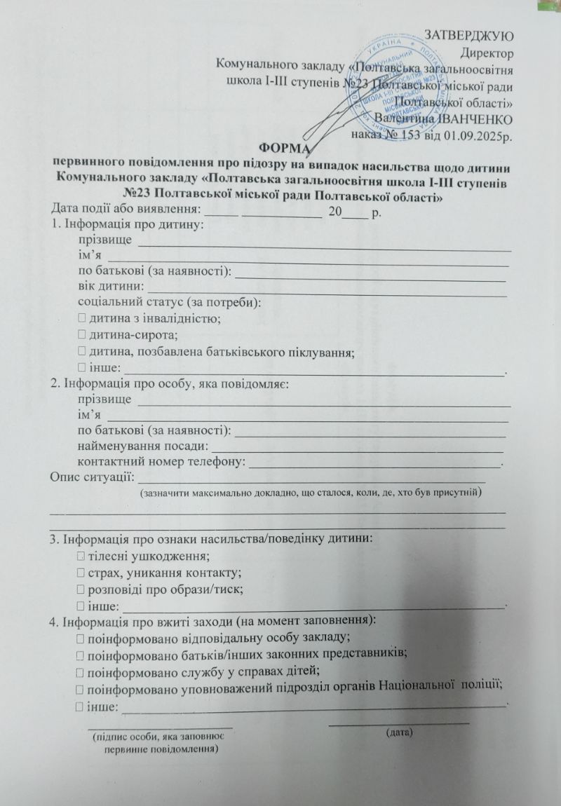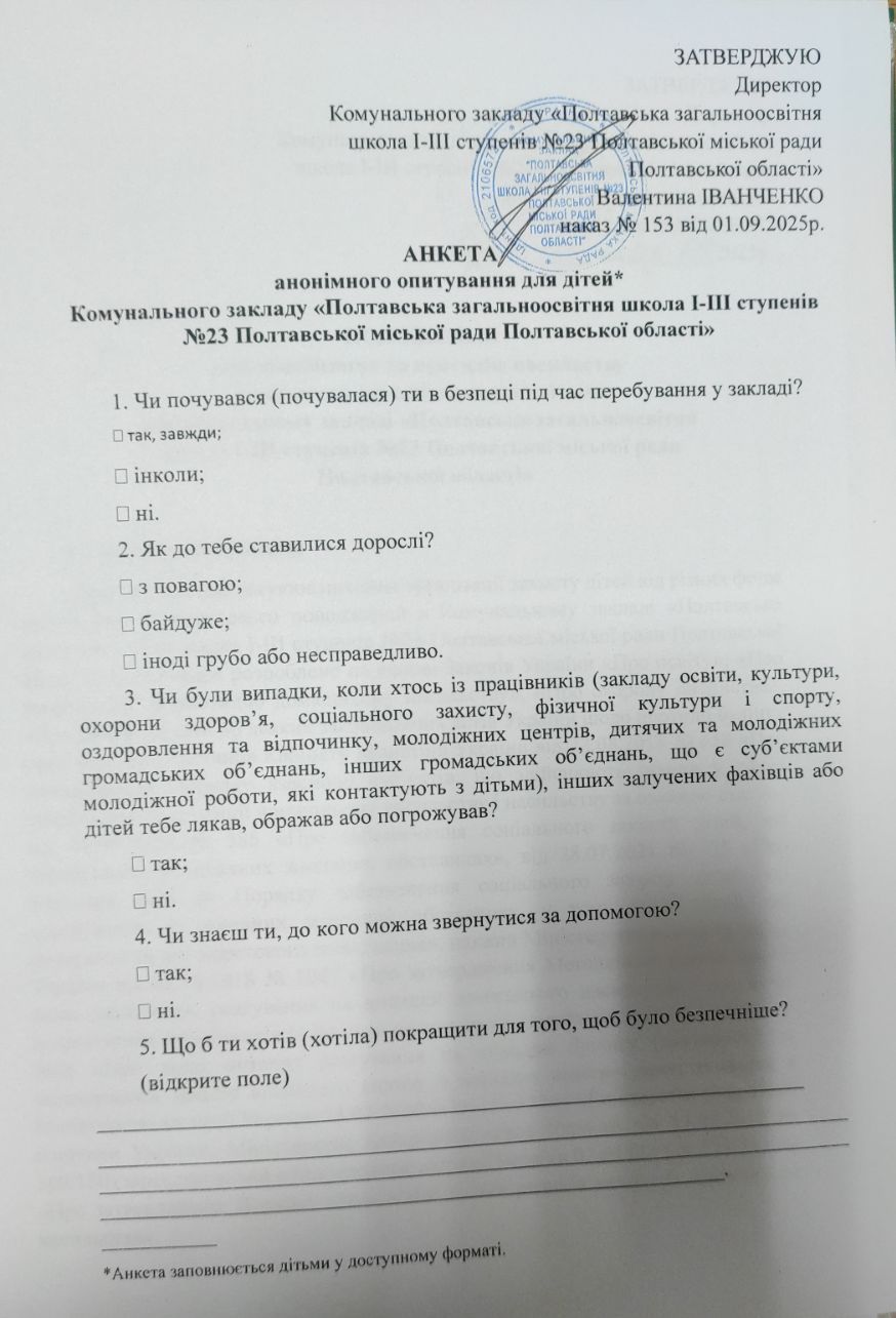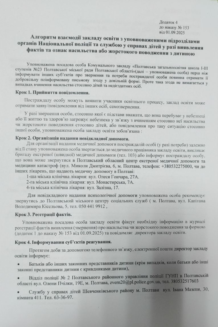 Наказом № 135 від 02.09.2024 року по Комунальному закладу «Полтавська загальноосвітня школа І-ІІІ ступенів №23 Полтавської міської ради Полтавської області» затверджено «Про створення комісії щодо розгляду випадків булінгу та впровадження антибулінгової політики в закладі». Наказом № 135/а від 02.09.2024 року по Комунальному закладу «Полтавська загальноосвітня школа І-ІІІ ступенів №23 Полтавської міської ради Полтавської області» затверджено «Про проведення інформаційної профілактики булінгу (цькування); попередженню насильства в учнівському середовищі, в сім’ї та жорстокого поводження з дітьми; домашнього насильства та насильства за ознакою статі»